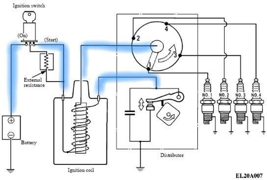 Kondisi putus-hubung pada rangkaian arus primer akan menimbulkan induksi listrik tegangan tinggi pada koil pengapian (ignition coil). Arus listrik bertegangan tinggi yang dihasilkan oleh koil pengapian selanjutnya didistribusikan ke masingmasing busi oleh distributor sesuai dengan FO (firing order) mesin bersangkutan.