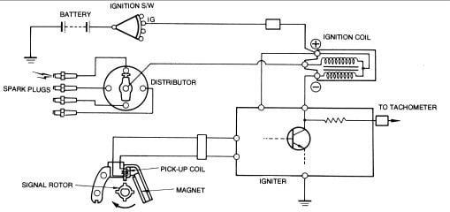 Rangkaian dari komponen-komponen sistem pengapian konvensional pada unit kendaraan ringan dapat dilihat pada pengkabelan (wiring diagram) sebagai berikut.