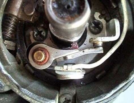 Prinsip kerja distributor adalah membagi arus tegangan tinggi ke masingmasing busi kendaraan dengan urutan pengapian sesuai dengan firing order mesin bersangkutan. Arus listrik tegangan tinggi dari koil diterima oleh terminal tengah yang ada pada tutup distributor dan disalurkan secara bergantian oleh rotor terhadap masing-masing busi melalui terminal bagian tepi pada tutup distributor. - Kontak pemutus (breaker point)