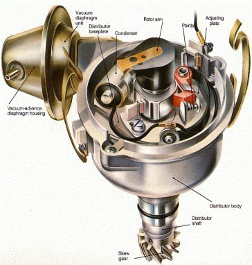 Prinsip kerja dari vacuum advancer adalah memanfaatkan kevacuuman yang terjadi pada intake manifold untuk menggeser dudukan platina agar terjadi pemajuan saat pengapian. Kevacuuman terjadi karena katup gas dalam kondisi menutup, kevacuuman yang terjadi menarik membran pada ruang vacuum, membran menarik batang penarik yang dihubungkan dengan plat dudukan platina di dalam distributor. - Kabel tegangan tinggi (high tension cord)