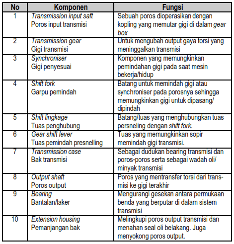 Sistem pemindah tenaga secara garis besar terdiri dari Unit kopling, transmisi, defrensial, poros dan roda kendaraan. Sementara Posisi transmisi manual dan komponennya, terletak pada ujung depan sesudah unit kopling dari sistem pemindah tenaga pada kendaraan. Fungsi transmisi adalah untuk mengatur perbedaan putaran antara putaran mesin (melalui unit kopling) dengan putaran poros yang keluar dari transmisi. Pengaturan putaran ini dimaksudkan agar kendaraan mampu bergerak sesuai dengan beban dan kecepatan kendaraan.