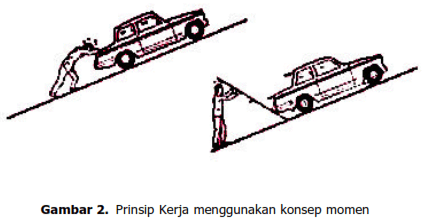 Berdasarkan gambar 2 tersebut, dapat dilihat perbedaan antara keduanya. Gambar pertama seseorang mendorong mobil ditanjakan secara langsung, sementara gambar kedua menggunakan tongkat pengungkit. Melihat kondisi tersebut, manakah diantara keduanya yang lebih ringan?. Jawabnya tentu dia yang menggunakan pengungkit, sebab pada posisi pertama gaya dorong secara langsung, sementara posisi kedua menggunakan transfer momen melalui tongkat. Semakin panjang lengan, maka tenaga yang dikeluarkan untuk mendorong kendaraan akan semakin ringan. Konsep dasar di atas kemudian dipergunakan dalam membuat desain transmisi, dimana lengan pengungkit tersebut diterapkan pada diameter roda gigi. Sehingga transmisi kendaraan juga disebut dengan gear box atau kotak roda gigi, karena komponen utama transmisi adalah roda gigi. Konsep pemindahan tenaga melalui roda gigi, seperti terlihat pada gambar 3 berikut ini.