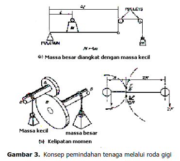 Gambar 3 (a) menggambarkan lengan pengungkit sederhana. Pada kodisi seimbang persamaannya M x l = m x 4l artinya massa m yang hanya ¼ M dapat mengangkat M. Hal ini menunjukan bahwa dengan gaya yang kecil dapat mengangkat massa yang beratnya 4 kali lipat, karena digunakannya sistem lengan pengungkit. Gambar 3 (b), menunjukkan bagaimana dua piringan dipergunakan sebagai lengan pengungkit. Pada contoh tersebut massa yang digantungkan pada poros C akan mengangkat beban yang ada pada poros D. Rangkaian ini mungkin dapat dipergunakan untuk memahami konsep kerja transmisi, mesin dihubungkan ke poros C, dan yang ke roda dihubungkan ke D. Apabila diameter piringan B dibuat tiga kali piringan A, maka momen yang dihasilkan tiga kali lipat. Namun bila perbandingan giginya (gear ratio) 2 : 1, maka roda gigi A berputar dua kali, sedangkan roda gigi B berputar 1 kali. Momen pada roda gigi A ½ dari roda gigi B, atau gaya angkatnya akan setengah dari beban yang diangkat.