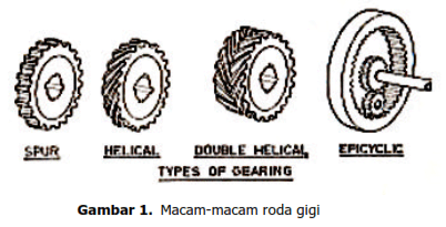 a). Roda gigi jenis Spur – bentuk giginya lurus sejajar dengan poros, dipergunakan untuk roda gigi geser atau yang bisa digeser (Sliding mesh).