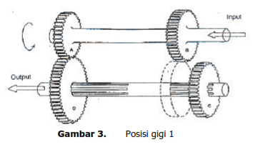 Roda gigi pada poros input yaitu berasal dari kopling, dipasang mati. Sedangkan roda gigi yang dipasang pada poros output dipasang geser/sliding. Roda gigi yang digunakan untuk model ini tentunya jenis spur. Perhatikan pada gambar 5 berikut ini.