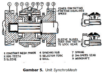 Pada putaran yang demikian tinggi yaitu 666 rpm, sementara kopling geser tidak berputar tentu tidak dapat dihubungkan. Untuk itu biasanya pengemudi, memutus hubungan poros input dengan mesin dengan menginjak pedal kopling. Meskipun demi-kian untuk putaran sebesar 666 rpm, disamping tidak/sulit dihubungkan, kalau dapat dihubungkan akan terjadi kejutan yang luar biasa. Kejutan ini dapat mengakibatkan kerusakan pada komponen transmisi. Oleh karena itu kemudian ditemukan sistem synchromesh. Sistem ini secara sederhana seperti terlihat pada gambar 8. Roda gigi transmisi dalam kondisi tetap, untuk memindahkan posisi kecepatan dipergunakan perlengkapan synchromesh, dimana dengan bentuk konisnya akan menyamakan putaran, baru kemudian gigi sleeve disambungkan. Kemampuan menyesuaikan putaran antara dua roda gigi yang akan disambungkan ini yang tidak dimiliki oleh kedua sistem sebelumnya.