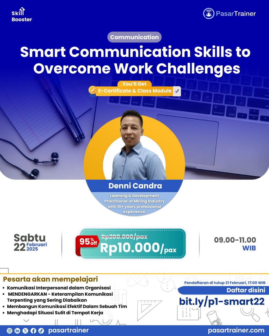 Saatnya upgrade skill komunikasi kamu bersama Denni Candra, seorang Learning & Development Practitioner di industri pertambangan dengan lebih dari 10 tahun pengalaman profesional!