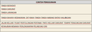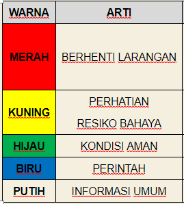 Makna dari warna tanda peringatan tersebut dan contoh penggunaannya bisa Anda lihat pada Tabel 1.Contoh-contoh bentuk dan warna tanda-tanda tersebut diperlihatkan pada Gambar 1