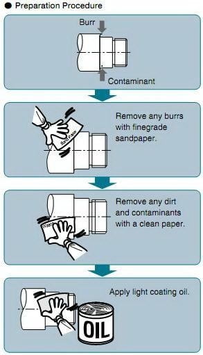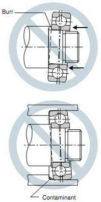 - Pertama-tama bersihkan setiap tonjolan tajam (burrs), serpihan metal (cutting chips), karat (rust) atau kotoran debu (dirt) dari permukaan tempat dudukan bearing. Pemasangan dapat dilakukan dengan mudah jika permukaan yang sudah bersih tersebut dilapisi dengan sedikit oli.