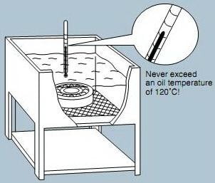 - Masukkan bearing kedalam oli dengan dikaitkan dengan gantungan atau dengan dudukan menggunakan metal screen untuk mencegah bersentuhan dengan elemen pemanas.