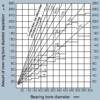 - Suhu yang diperlukan memanaskan inner ring should tergantung pada jumlah interference fit dari permukaan bearing dengan shaft nya. Perhatikan grafik dibawah ini untuk menentukan berapa panas yang diperlukan dalam pemanasan suatu bearing.