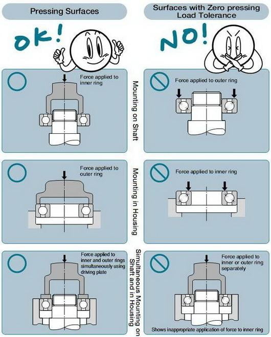 Pada saat memasang yang penting bantalan tidak boleh miring dengan dudukan permukaan dalam lubang, kalau miring maka tidak akan masuk secara lancar. Begitu juga pada saat pembongkaran harus sesuai dengan posisi dudukan bantalan.