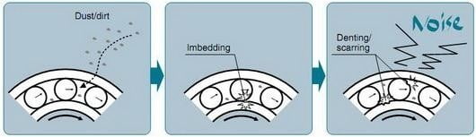 Bearing juga sangat mudah terkontaminasi dengan material asing. Jika material asing masuk kedalam bearing saat berputar, material asing tersebut akan menggores sehingga menyebabkan putaran bearing terganggu dan menimbulkan suara yang kasar.