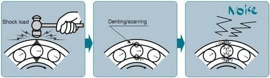 Bearings menahan bebannya pada kontak permukaan yang sangat sempit diantara bagian yang berputar (roller) dan diantara permukaan inner dan outer race. Jika ada beban berlebihan atau beban kejut yang terjadi pada bagian tersebut, akan menimbulkan luka gores. Kerusakan ini memicu suara yang kasar dan getaran berlebihan dan juga putaran yang kasar. Kerusakan ini bisa juga tejadi akibat dari bearing terjatuh ke lantai dengan tegak lurus.