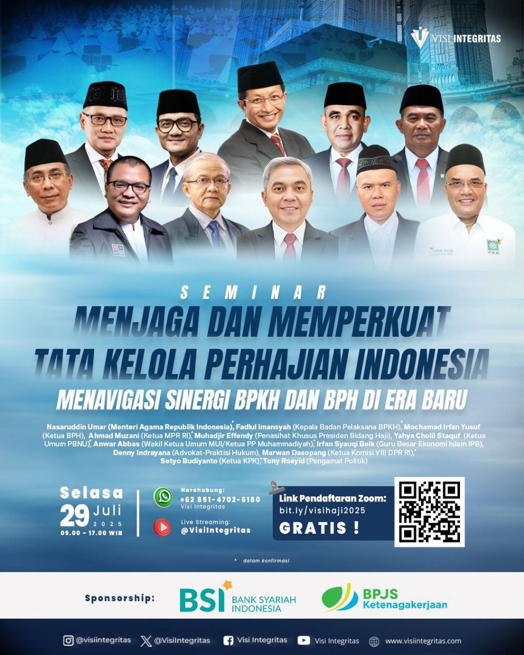 Nasaruddin Umar (Menteri Agama Republik Indonesia)*, Fadlul Imansyah (Kepala Badan Pelaksana BPKH), Mochamad Irfan Yusuf (Ketua BPH)*, Ahmad Muzani (Ketua MPR RI)*, Muhadjir Effendi (Penasihat Khusus Presiden Bidang Haji), Yahya Cholid Staquf (Ketua Umum PBNU)*, Anwar Abbas (Wakil Ketua Umum MUI/Ketua PP Muhammadiyah)*, Irfan Syauqi Beik (Guru Besar Ekonomi Islam IPB), Denny Indrayana (Advokat-Akademisi), Marwan Dasopang (Ketua Komisi VIII DPR RI)*, Setyo Budiyanto (Ketua KPK)*, Tony Rosyid (Pengamat Politik) (* dalam konfirmasi)