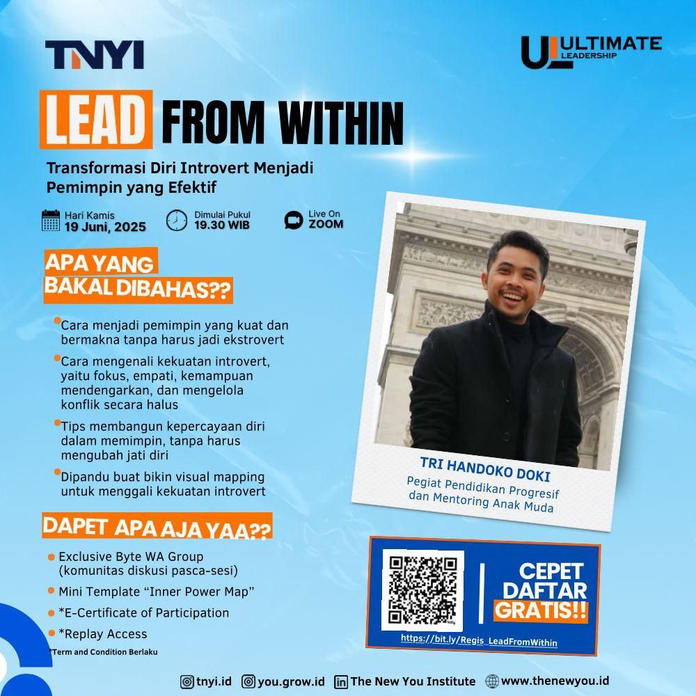 Yuk gabung di sesi “*Lead From Within: Transformasi Diri Introvert Jadi Pemimpin Efektif*” bersama Tri Handoko Doki — pegiat pendidikan progresif, mentor muda, dan LPDP awardee, yang akan membimbing kita *mengenali kekuatan introvert dalam kepemimpinan*.