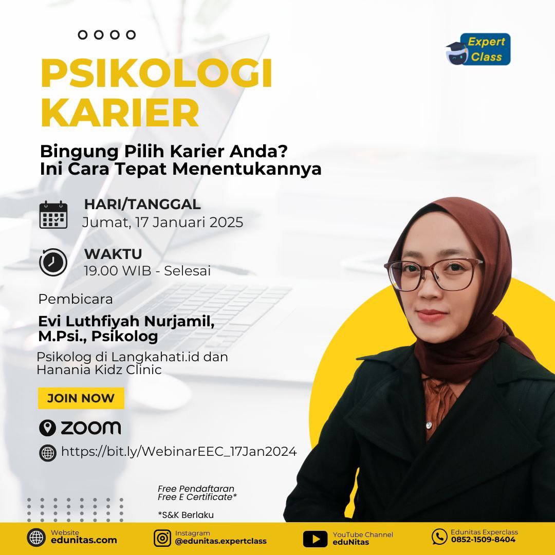 Apakah Anda sedang bimbang menentukan jalur karier yang akan Anda ambil? Yuk, ikuti webinar ini untuk menemukan cara terbaik dalam menentukan karier yang sesuai dengan minat dan potensi Anda.