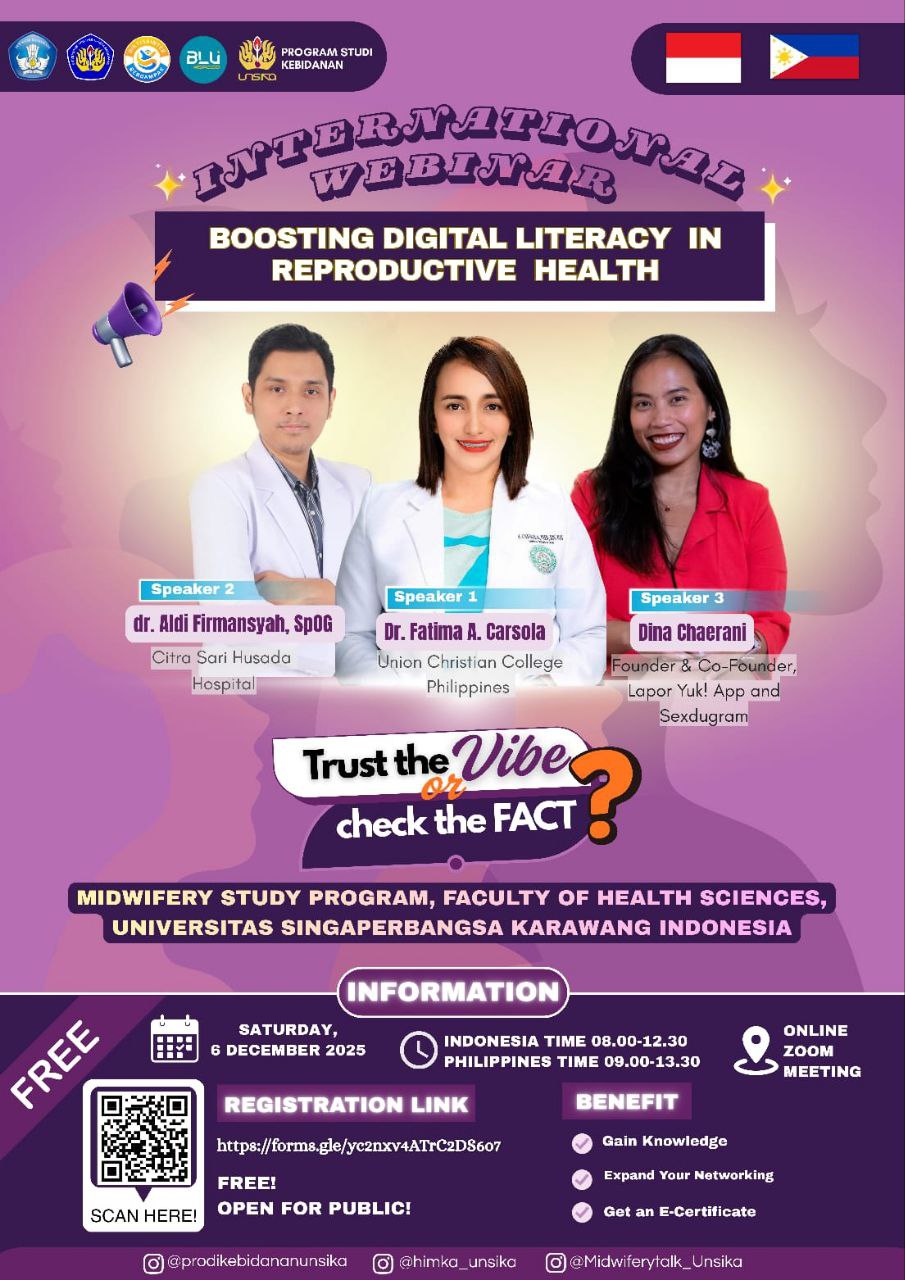 Program Studi Kebidanan Fakultas Ilmu Kesehatan UNSIKA kembali hadir dengan *International Webinar* spesial yang akan membahas pentingnya literasi digital dalam kesehatan reproduksi remaja. Wajib untuk kamu yang ingin menambah wawasan, memperluas relasi, dan mendapatkan insight dari narasumber kelas internasional! π‘π