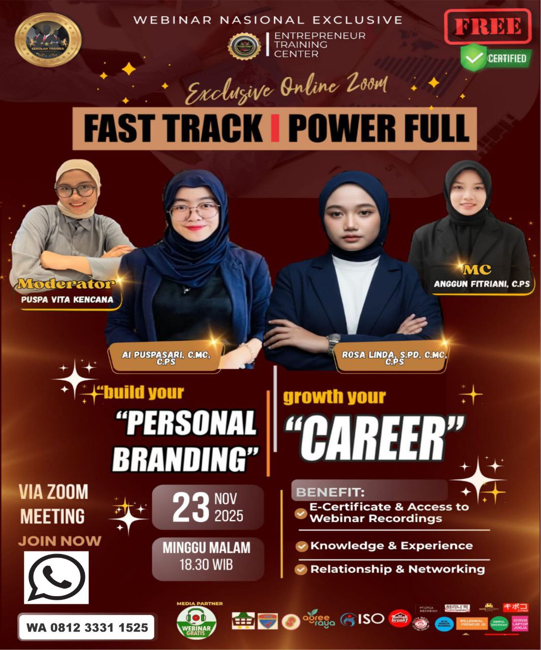 – Rosa Linda, S.Pd, C.MC, C.PS ( Profesional Public Speaker )