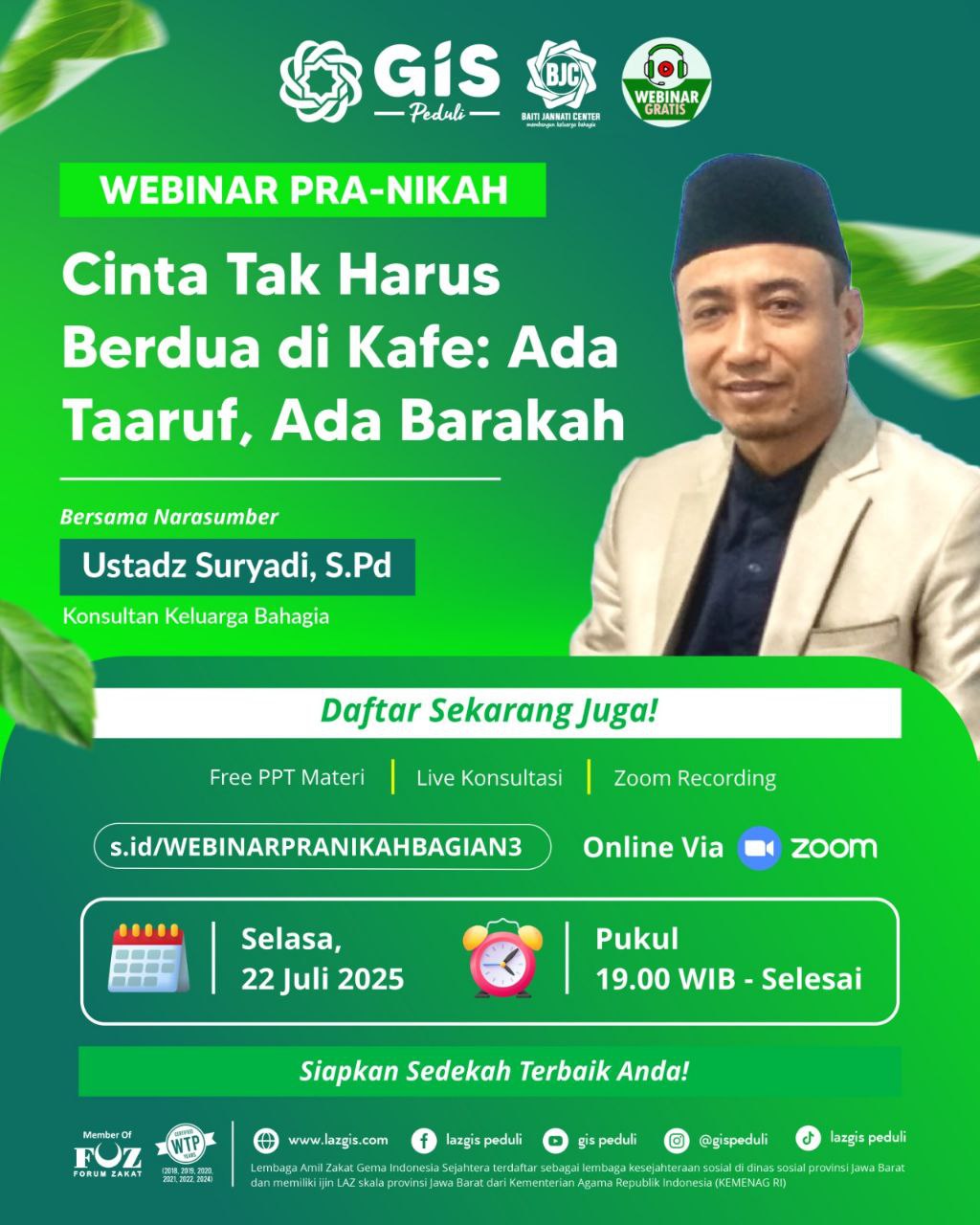 Yuk ikut *WEBINAR PRA-NIKAH* yang akan membahas cinta dengan cara yang syarโi, bukan sekadar berdua di kafe karena *ada taaruf, ada barakah!*
